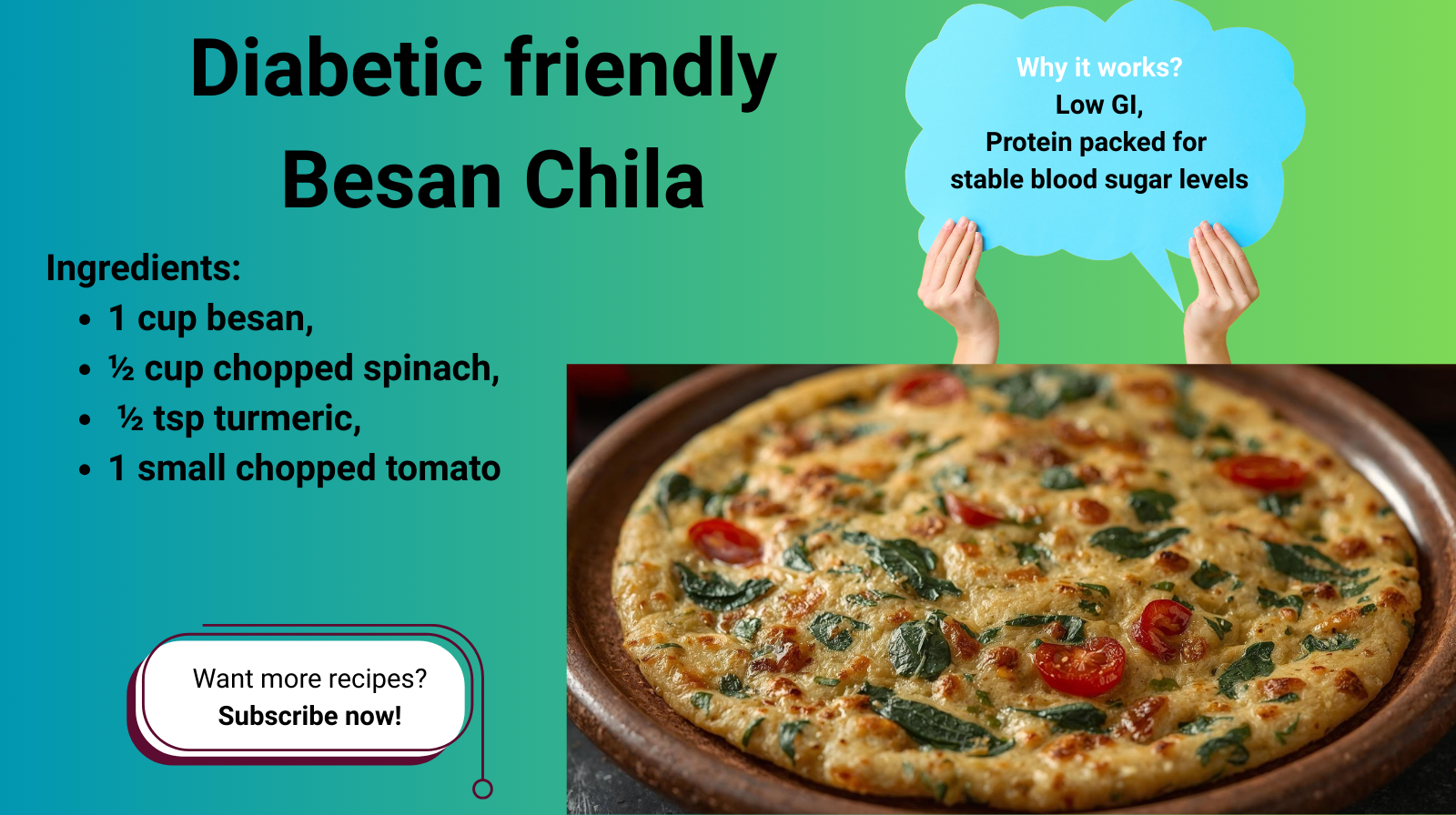 💡 Why it works: Besan (gram flour) is protein-packed and low-GI, helping maintain stable blood sugar without spikes. - Mid-Morning: Pear or guava.
